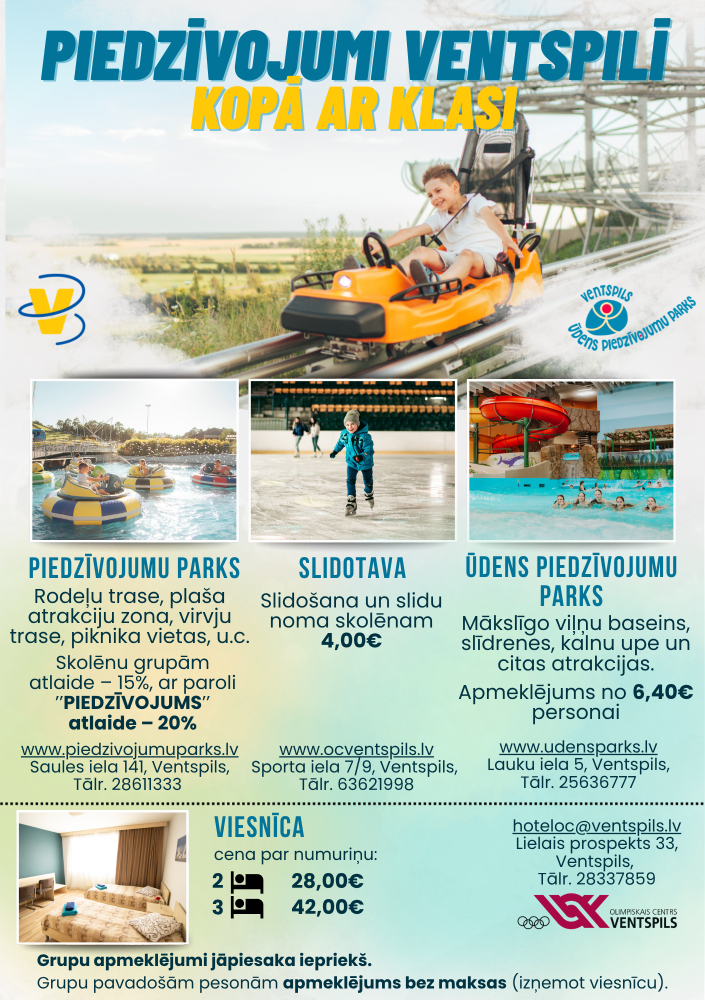 Olimpiskā centra “Ventspils” atpūtas objektos - Piedzīvojumu parkā, Ūdens piedzīvojumu parkā, Ledus hallē un viesnīcā tiek gaidītas klašu grupas.